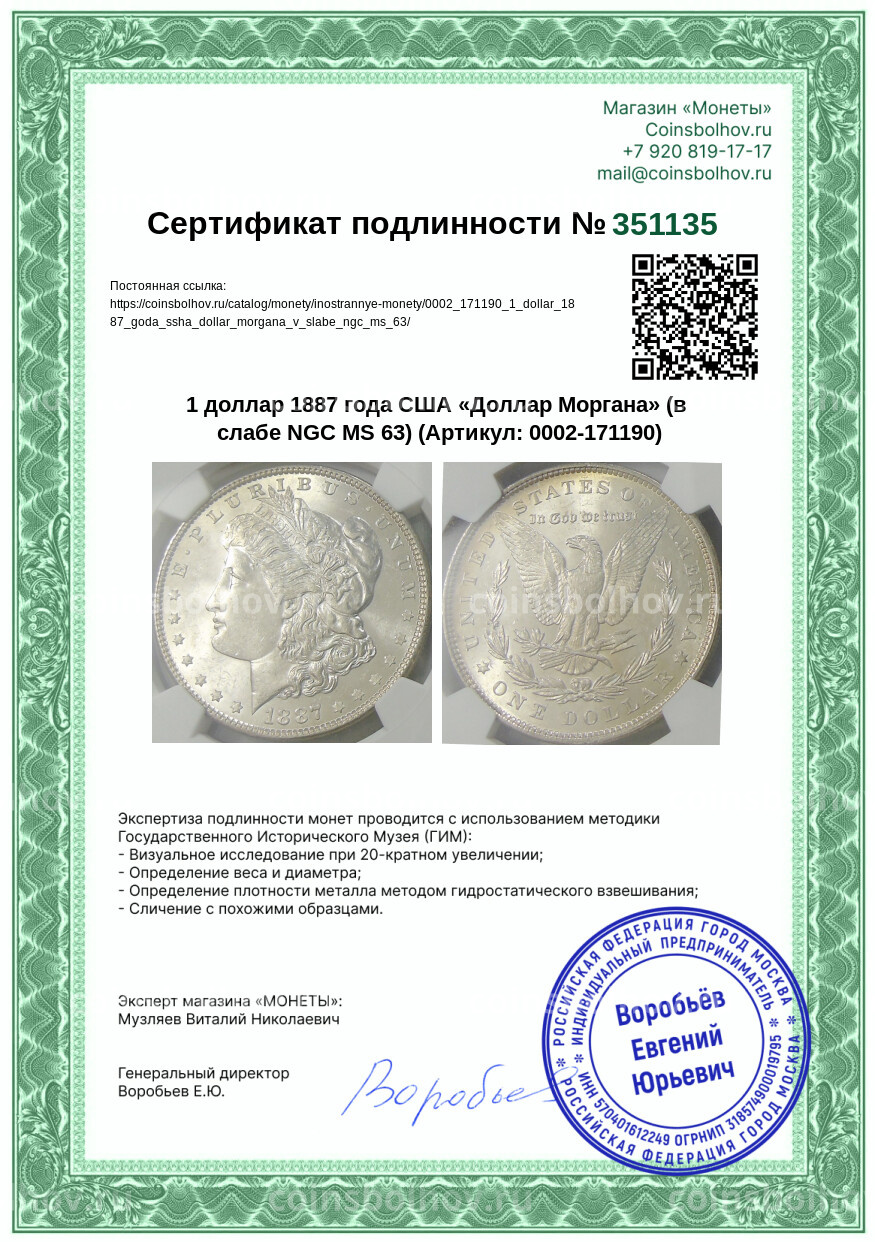 Монета 1 доллар 1887 года США «Доллар Моргана» (в слабе NGC MS 63)