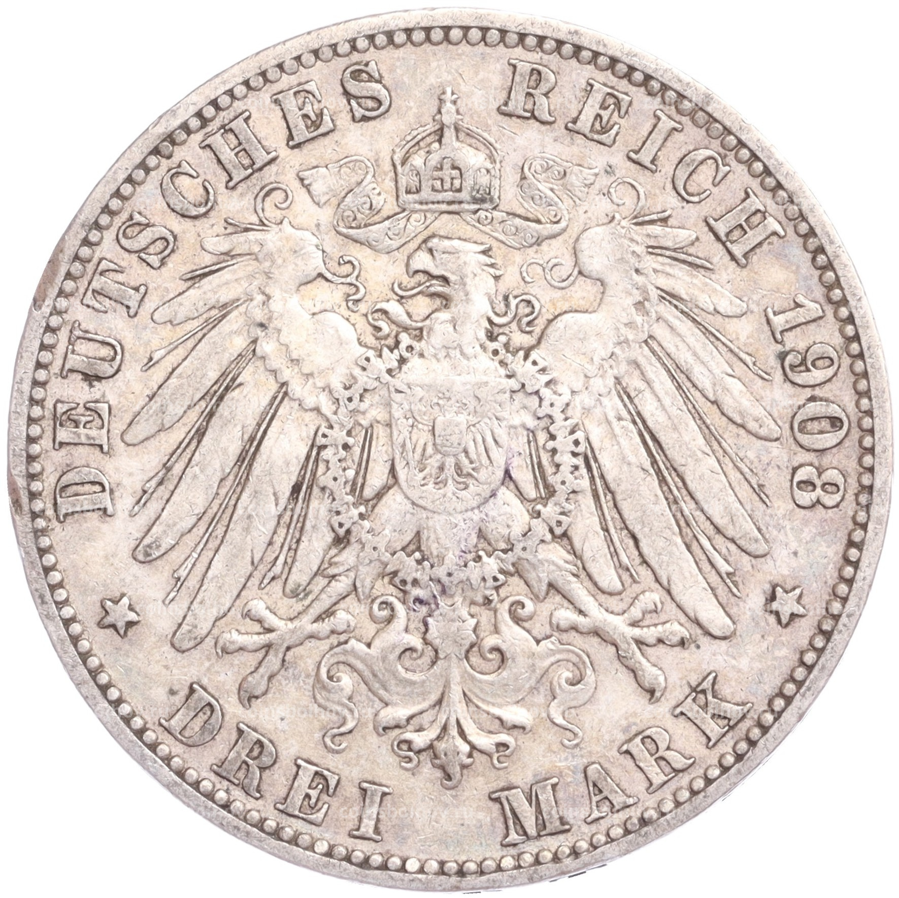Монета 3 марки 1908 года А Германия (Пруссия) (аверс) Монета 3 марки 1908 года А Германия (Пруссия) (реверс)