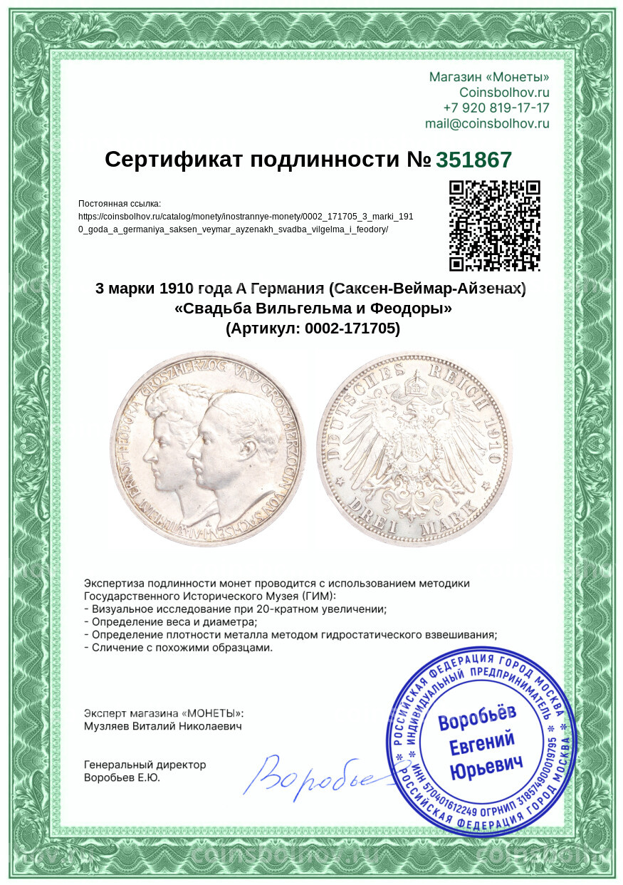 Монета 3 марки 1910 года A Германия (Саксен-Веймар-Aйзенах) «Свадьба Вильгельма и Феодоры»