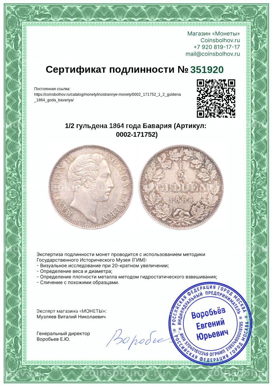 Монета 1/2 гульдена 1864 года Бавария