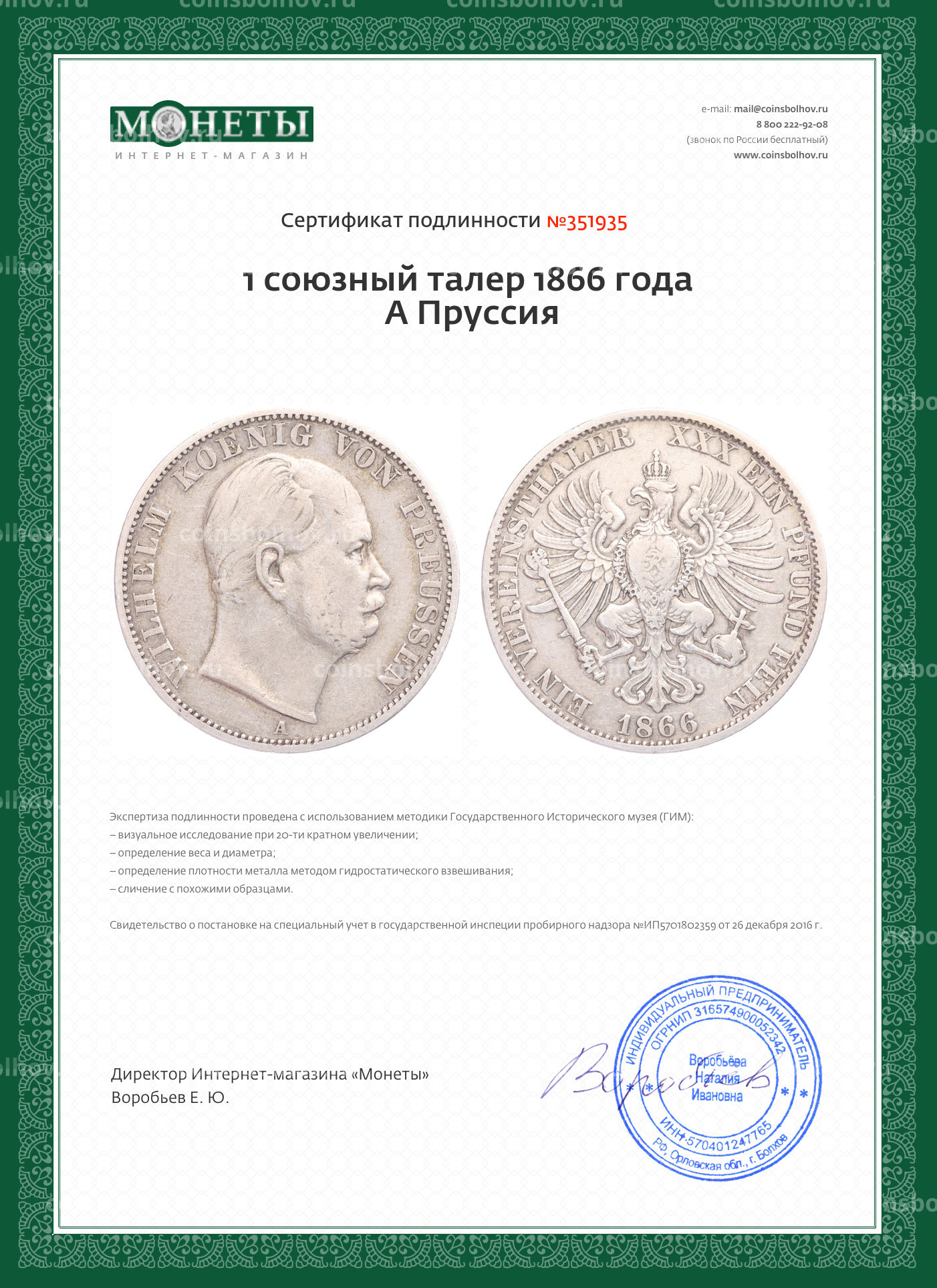 - Номинал 1 талер