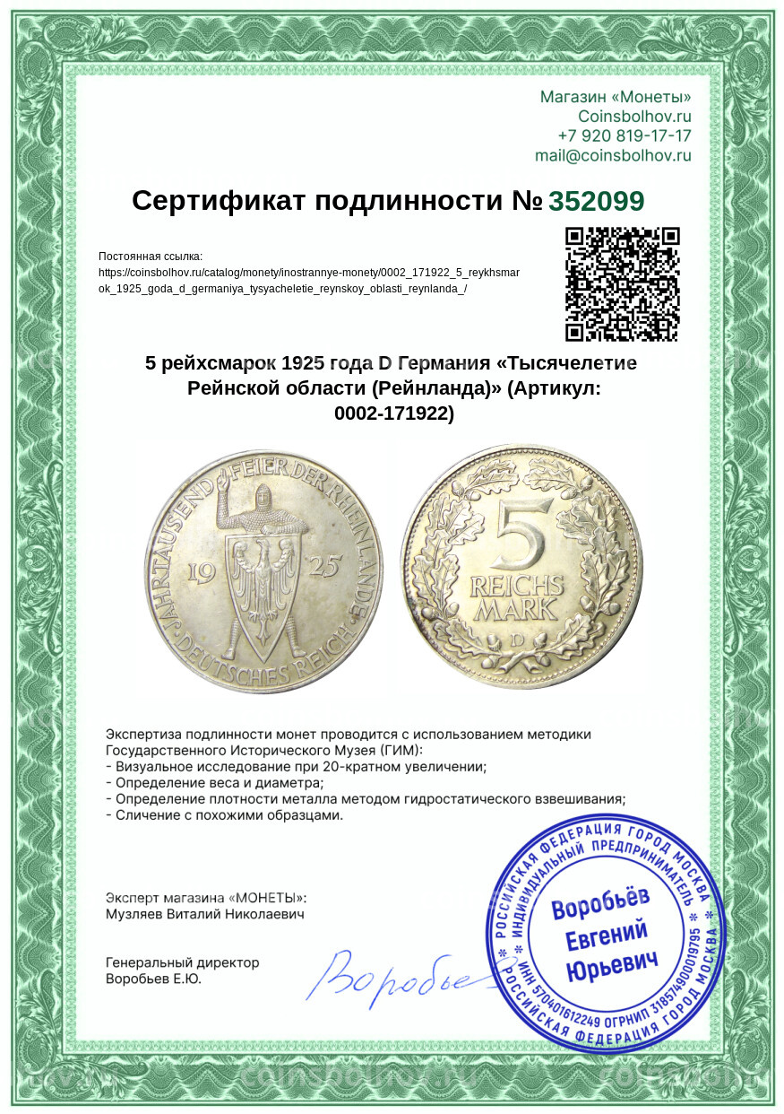 Монета 5 рейхсмарок 1925 года D Германия «Тысячелетие Рейнской области (Рейнланда)»