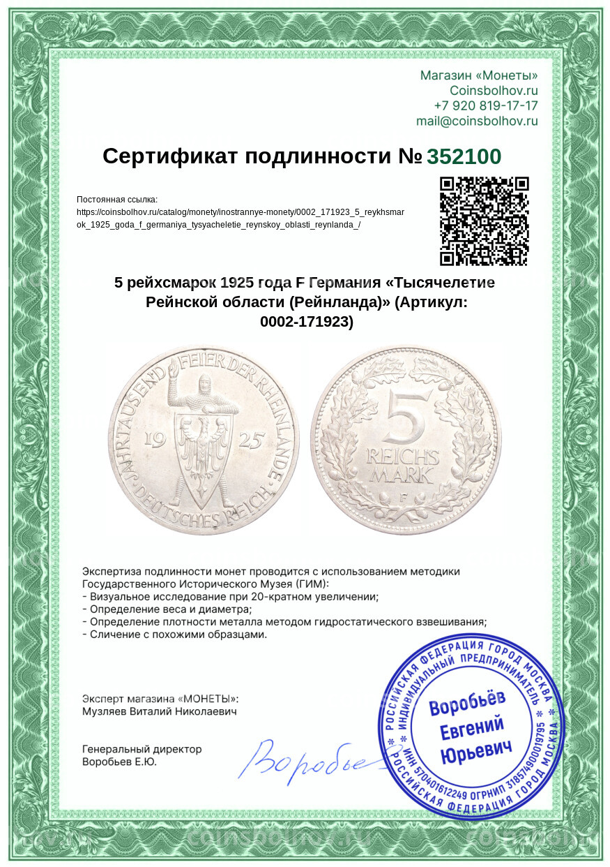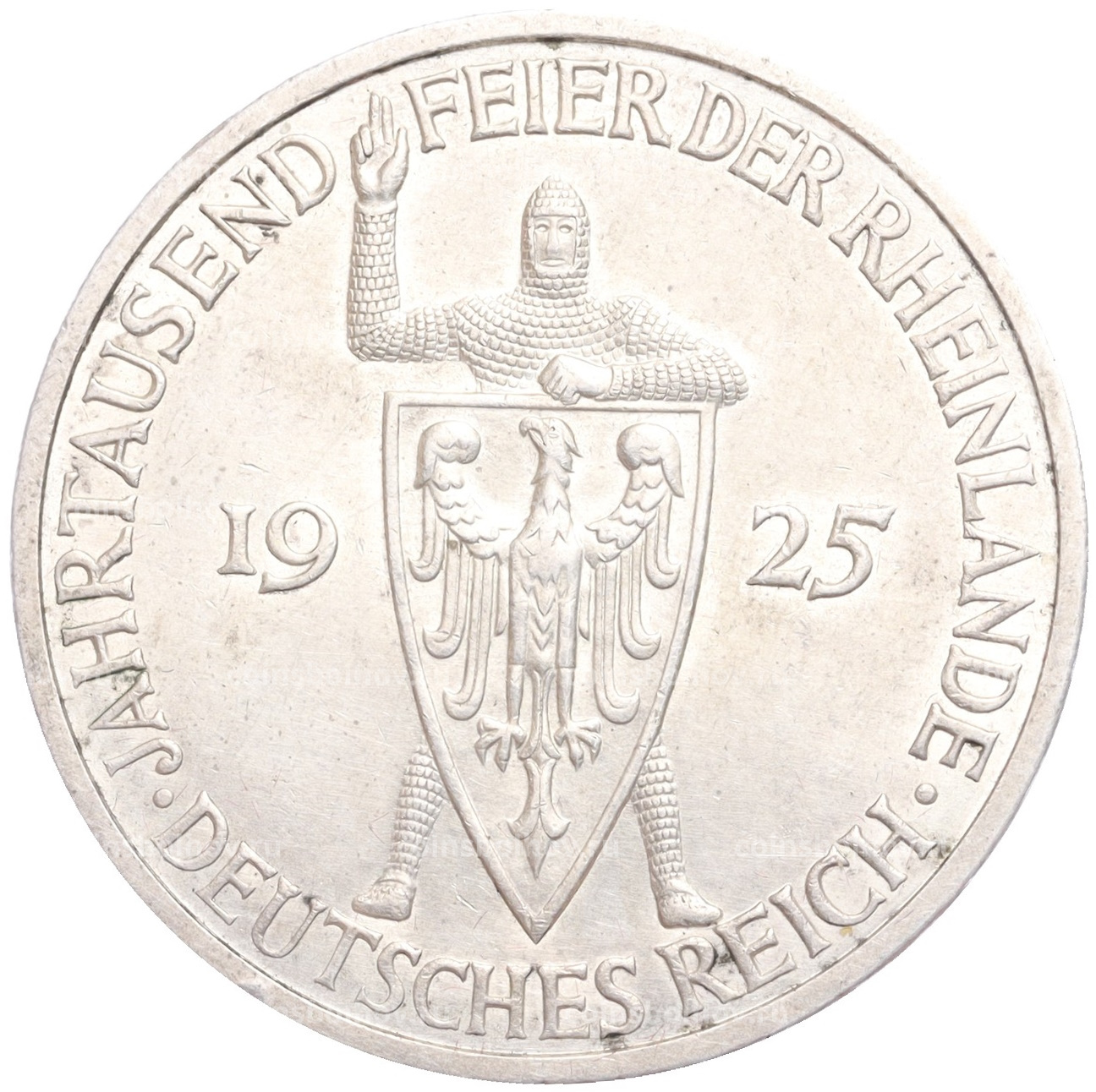 Монета 5 рейхсмарок 1925 года F Германия «Тысячелетие Рейнской области (Рейнланда)»