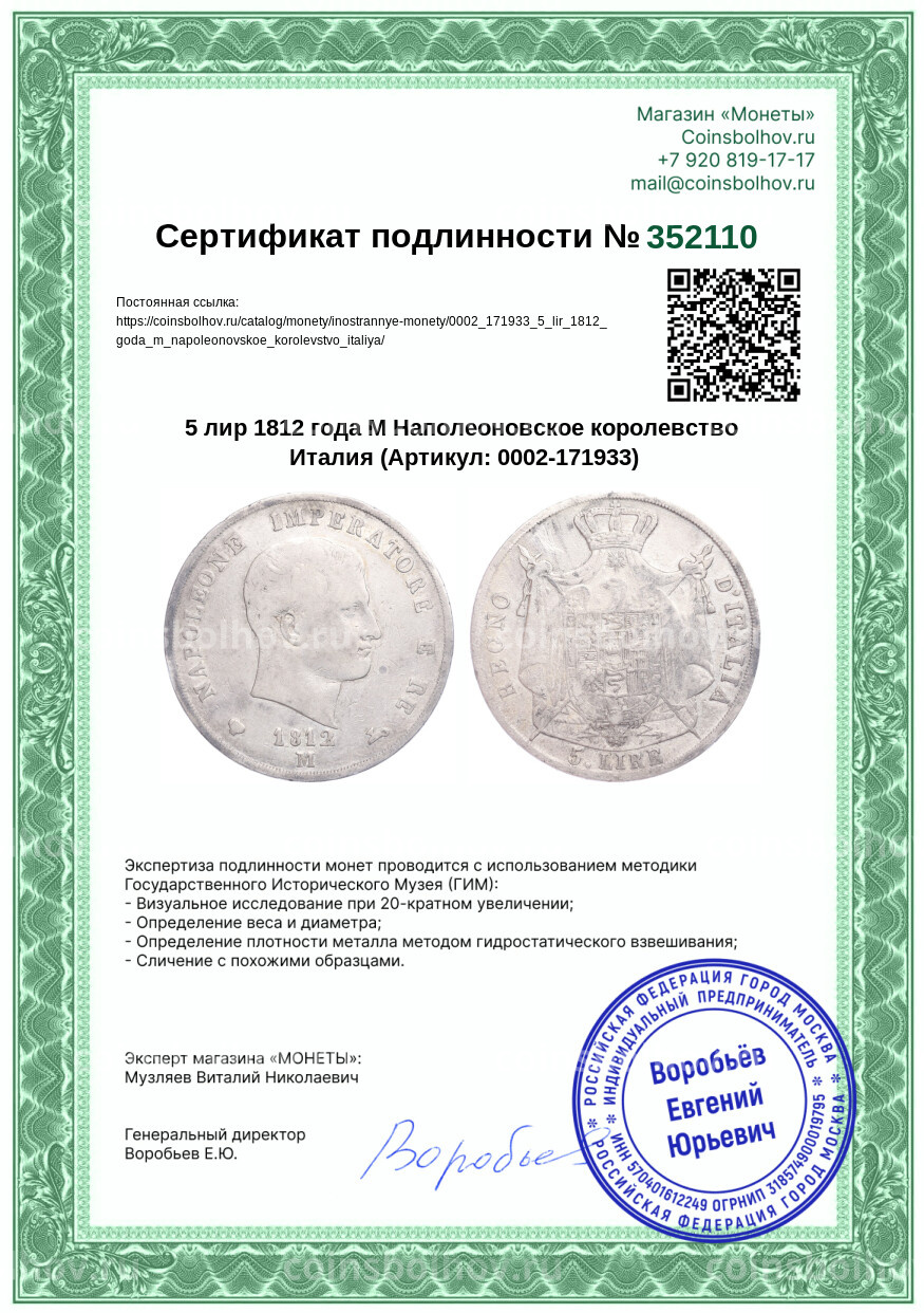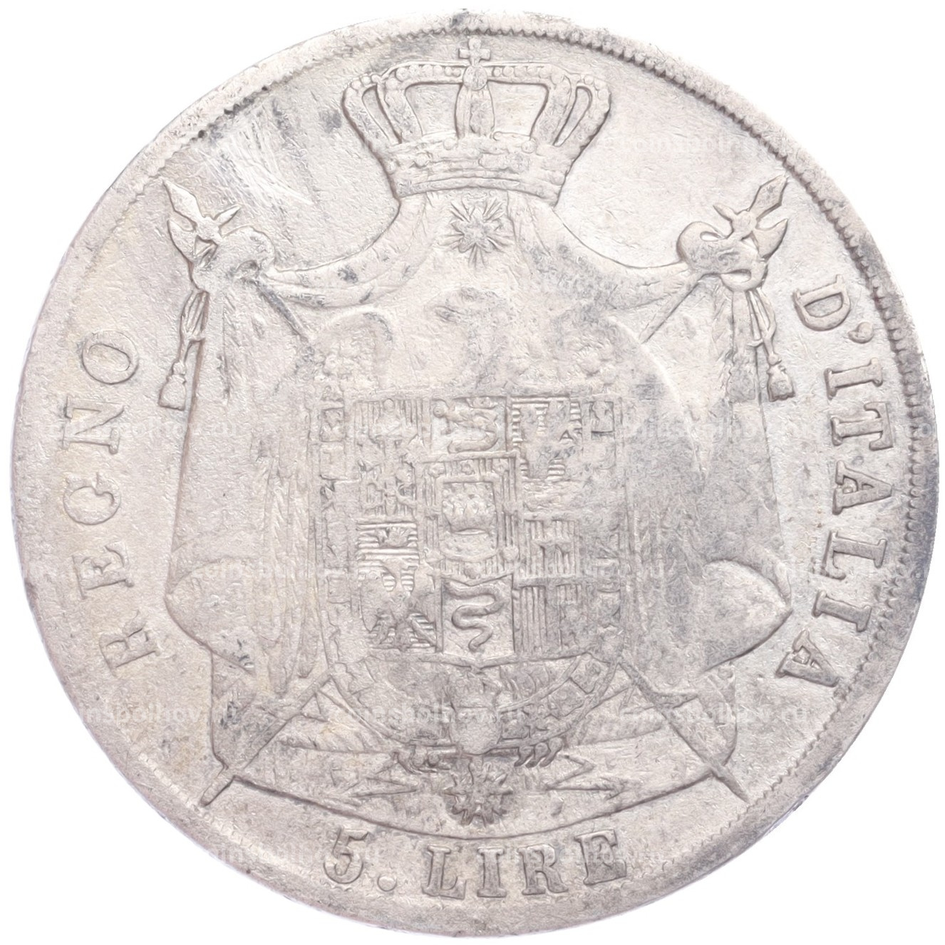Монета 5 лир 1812 года М Наполеоновское королевство Италия