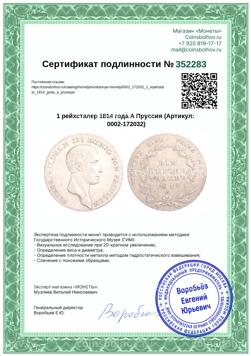 Монета 1 рейхсталер 1814 года A Пруссия