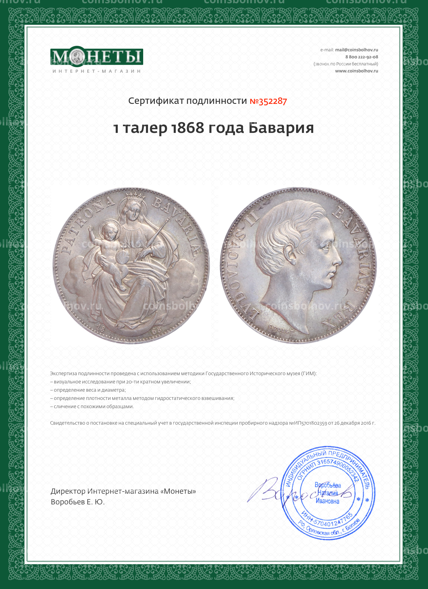 1 талер 1868 года Бавария