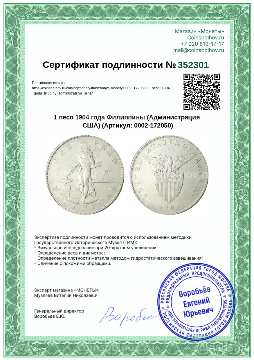 Монета 1 песо 1904 года Филиппины (Администрация США)