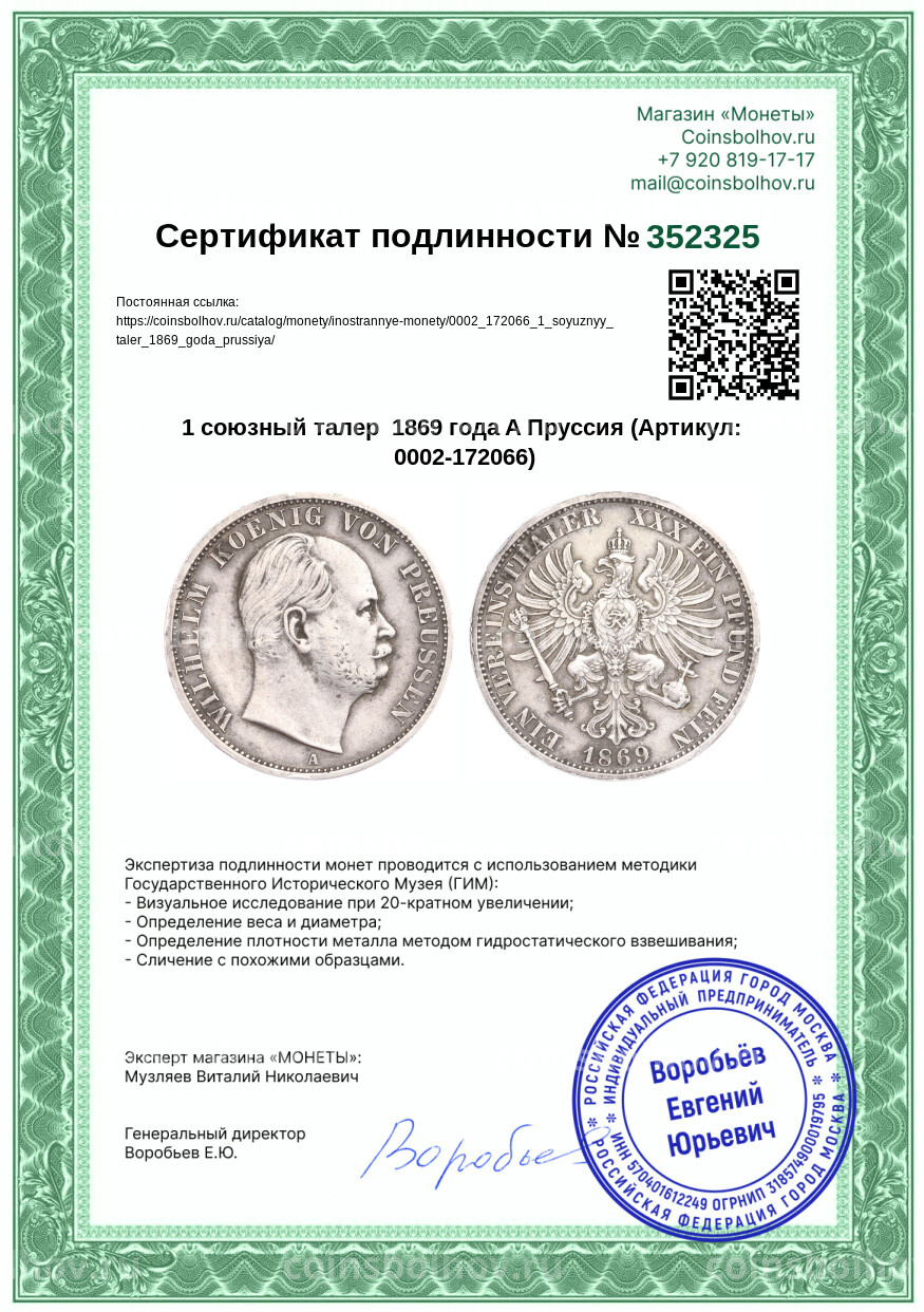 Монета 1 союзный талер 1869 года A Пруссия