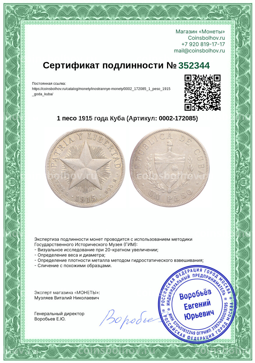 Монета 1 песо 1915 года Куба