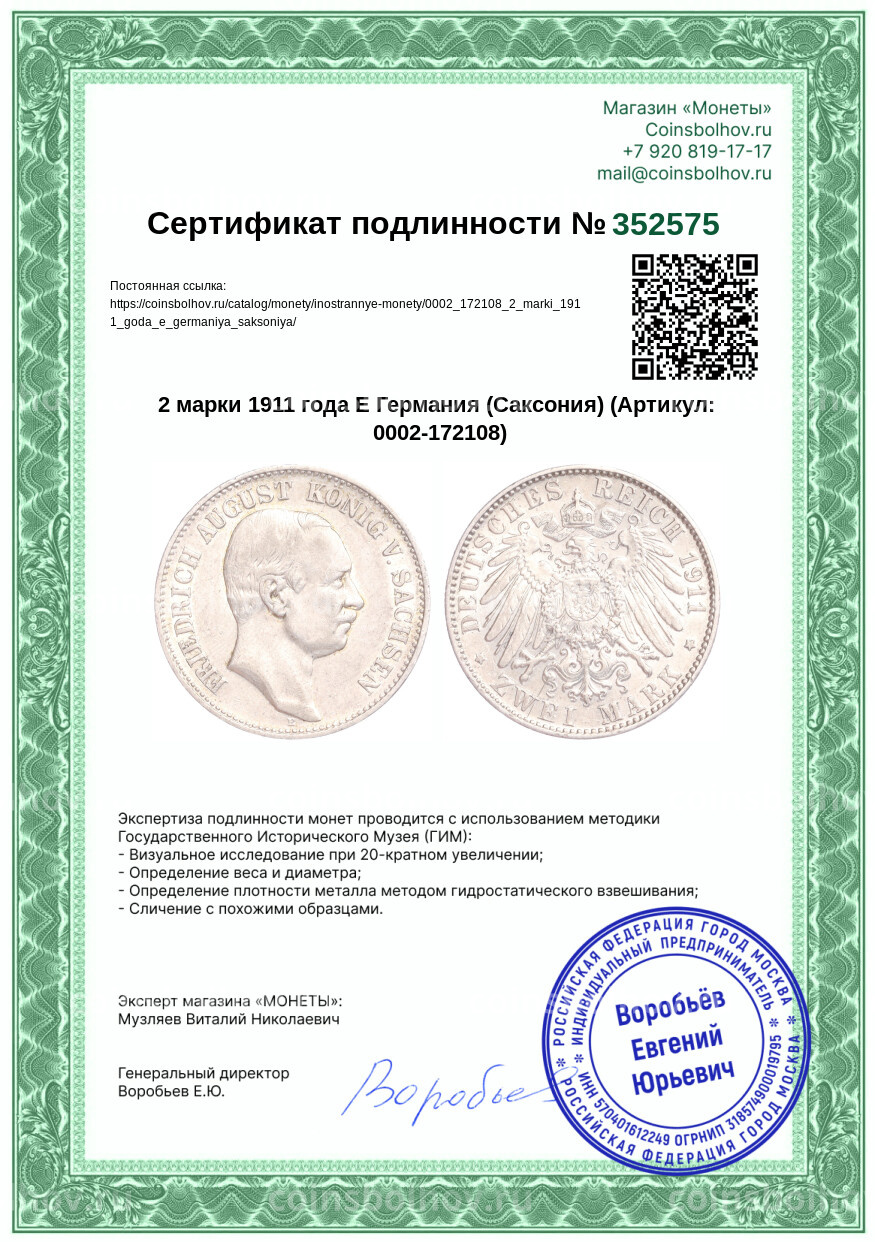 Монета 2 марки 1911 года Е Германия (Саксония)