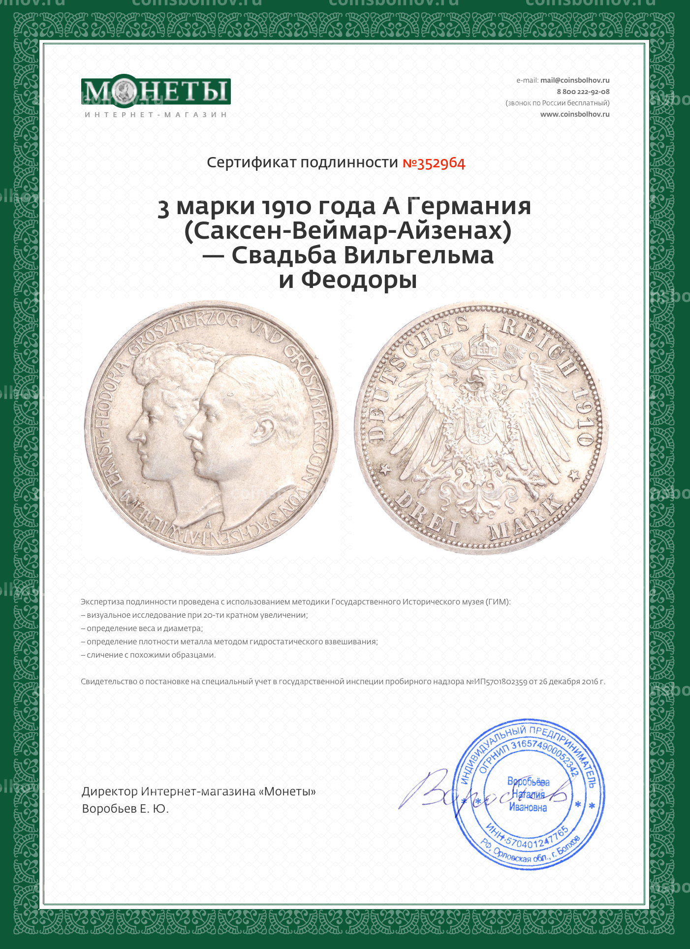 3 марки 1910 года A Германия (Саксен-Веймар-Aйзенах) «Свадьба Вильгельма и Феодоры»