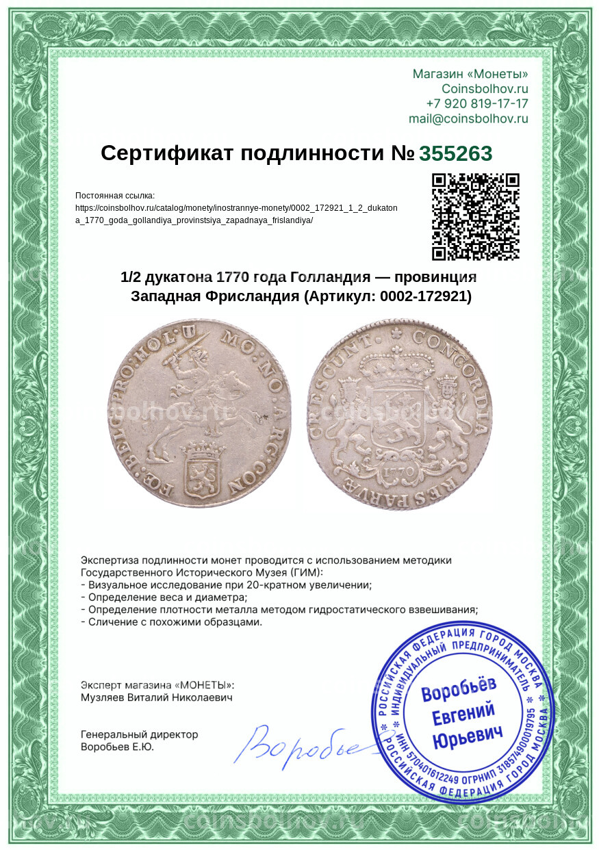 Монета 1/2 дукатона 1770 года Голландия — провинция Западная Фрисландия