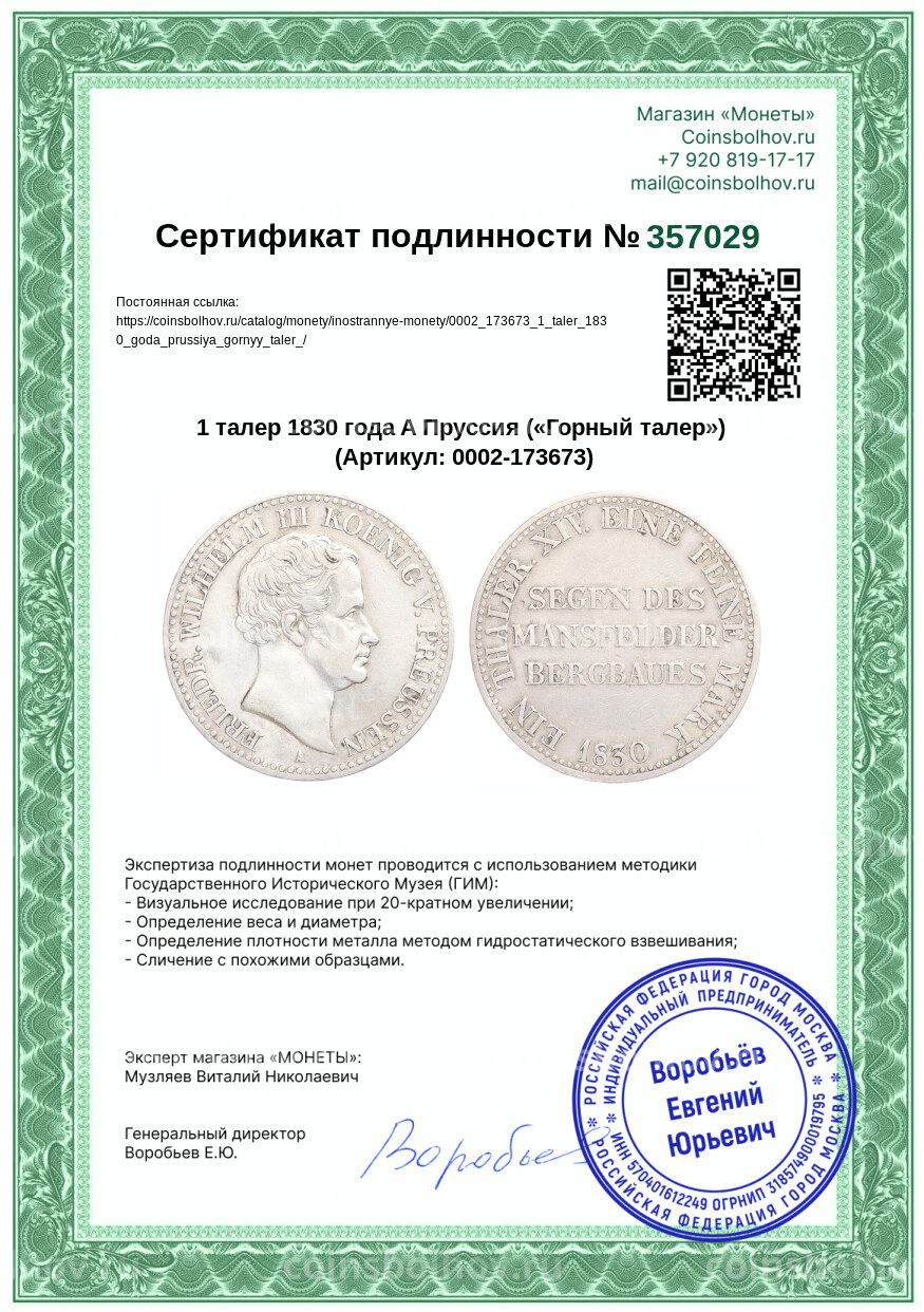 Монета 1 талер 1830 года A Пруссия («Горный талер»)