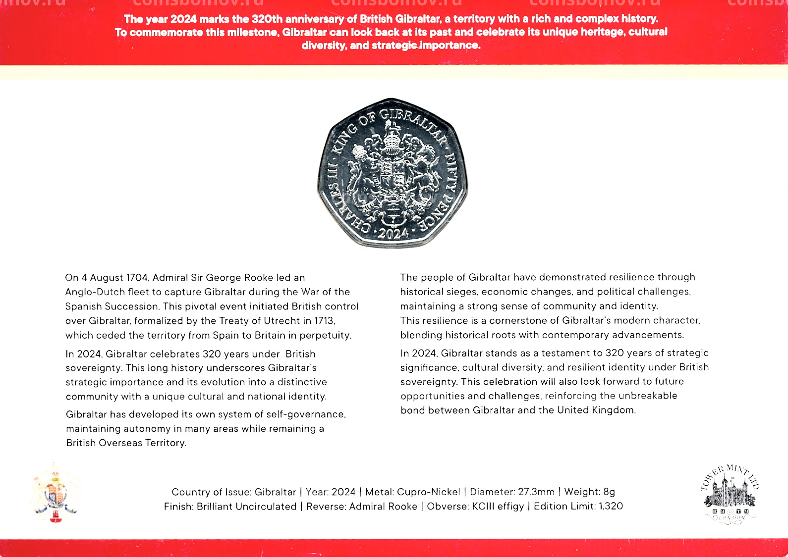 Монета 50 пенсов 2024 года Гибралтар «320 лет захвату Гибралтара» (в блистере)