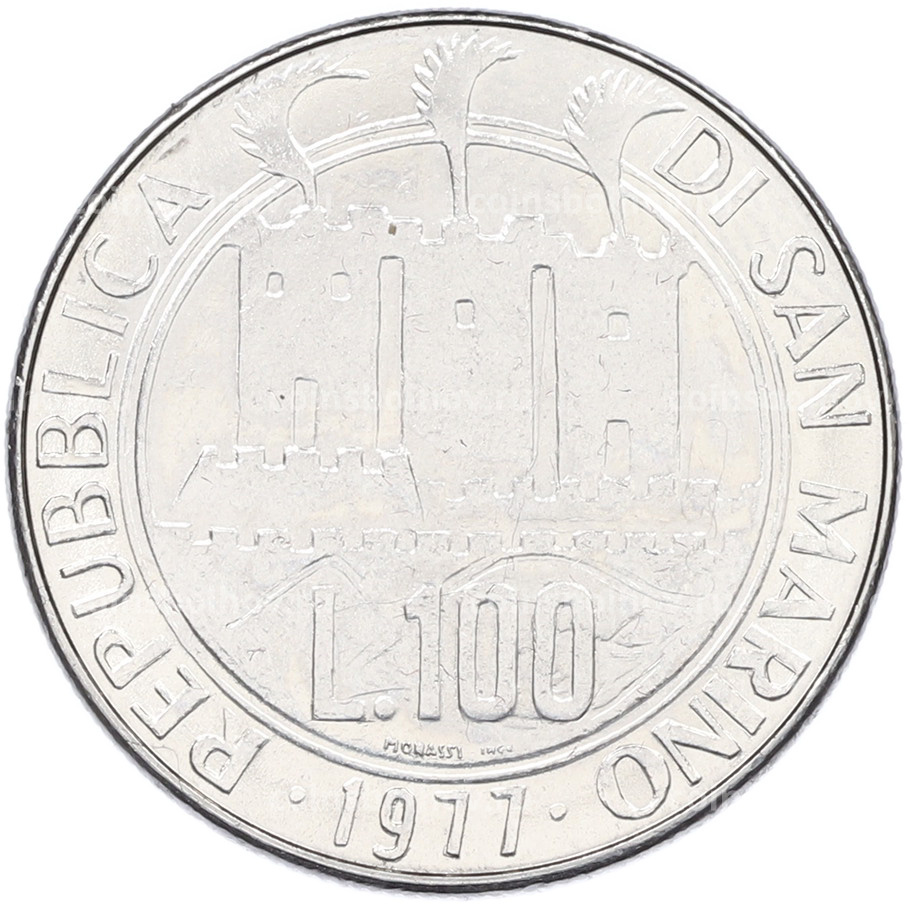 Монета 100 лир 1977 года Сан-Марино «Экология — Кольцо из звезд»