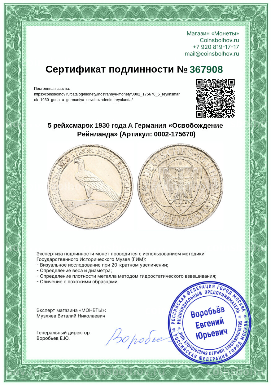 Монета 5 рейхсмарок 1930 года A Германия «Освобождение Рейнланда»