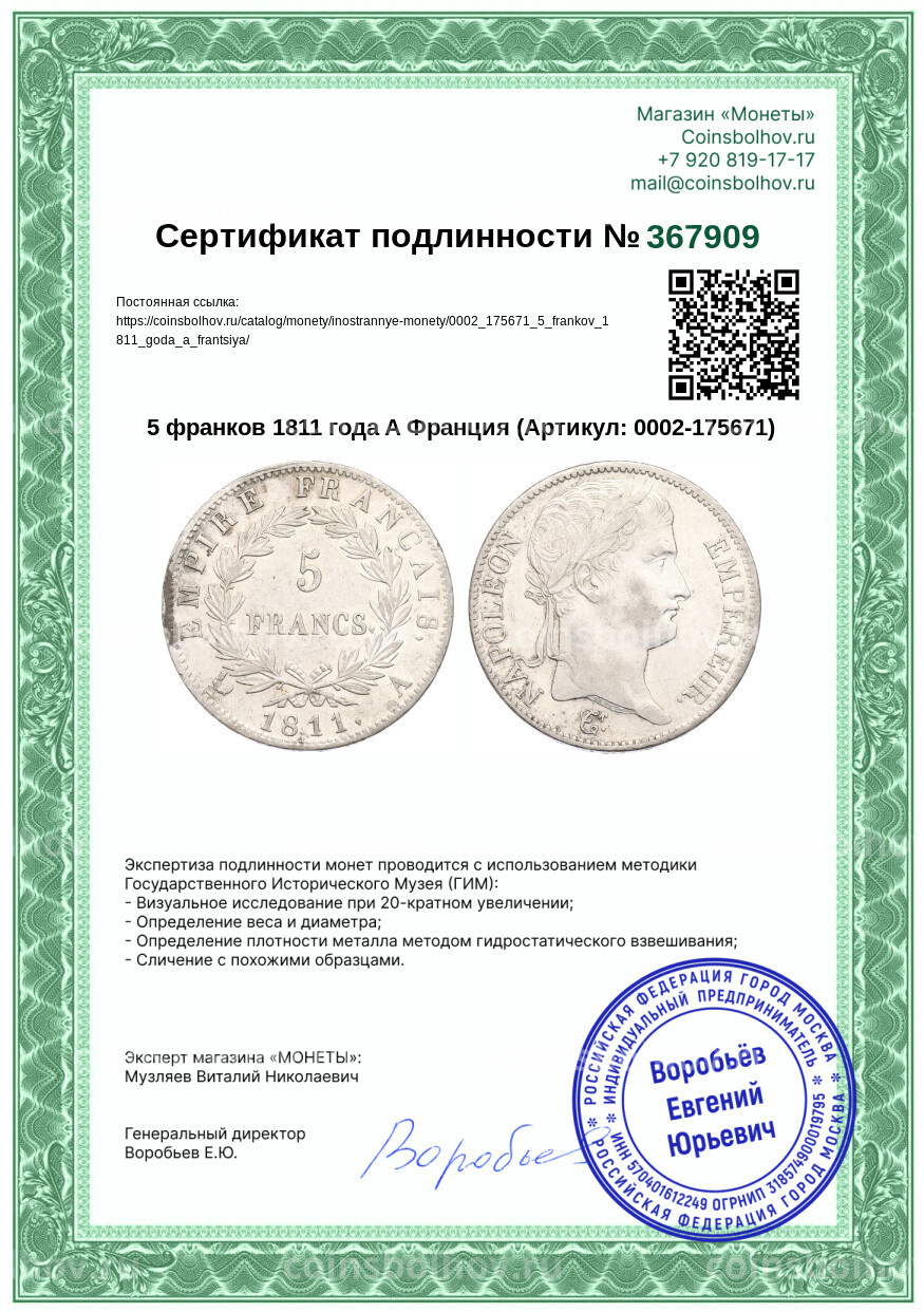 Монета 5 франков 1811 года A Франция