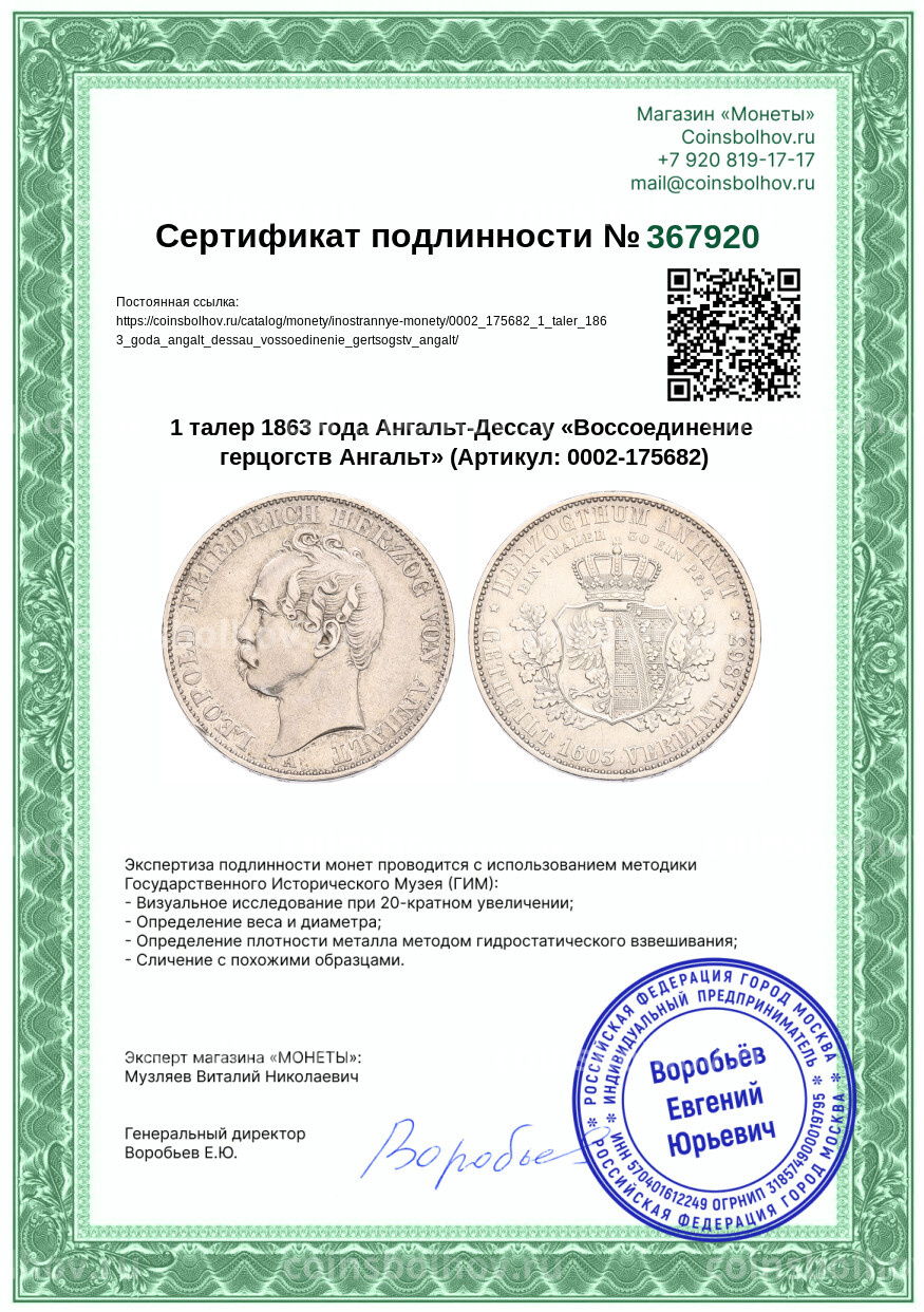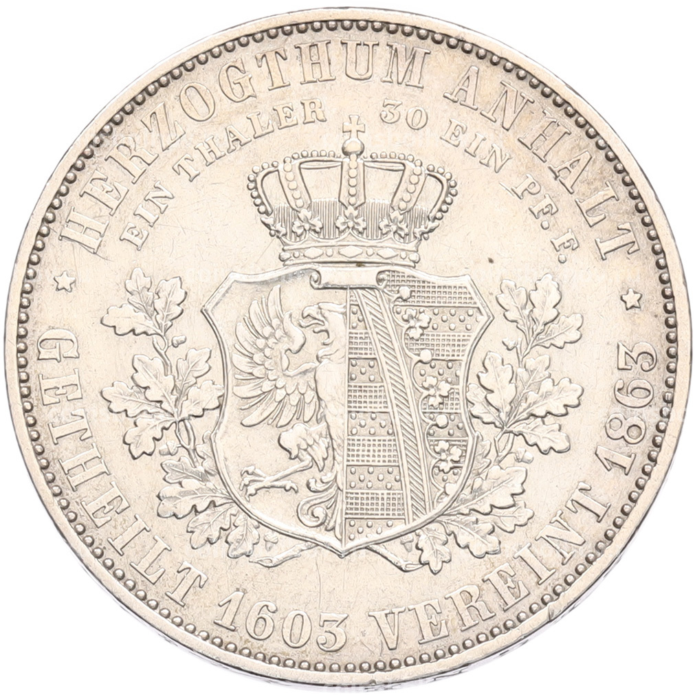 Монета 1 талер 1863 года Ангальт-Дессау «Воссоединение герцогств Ангальт»