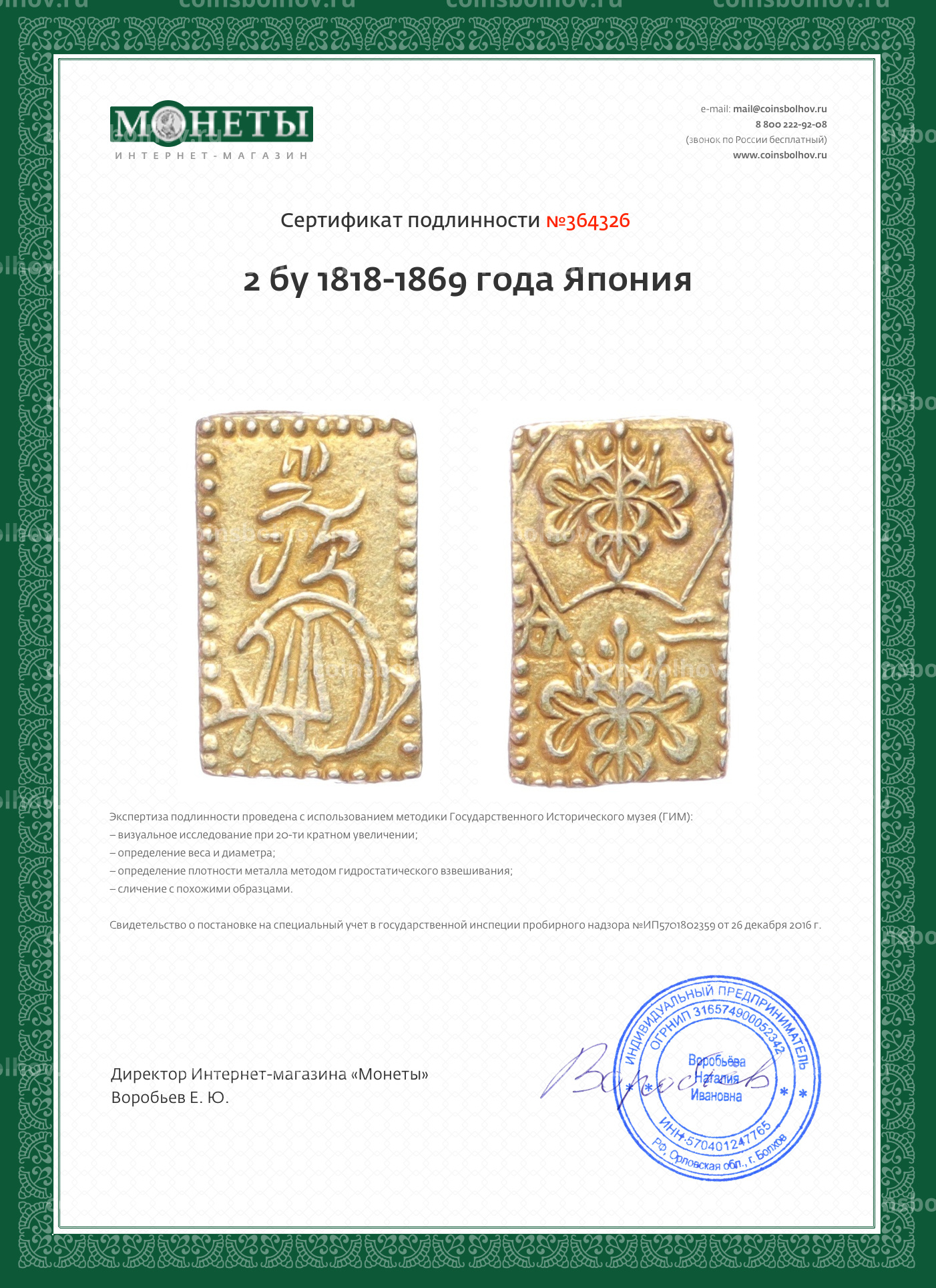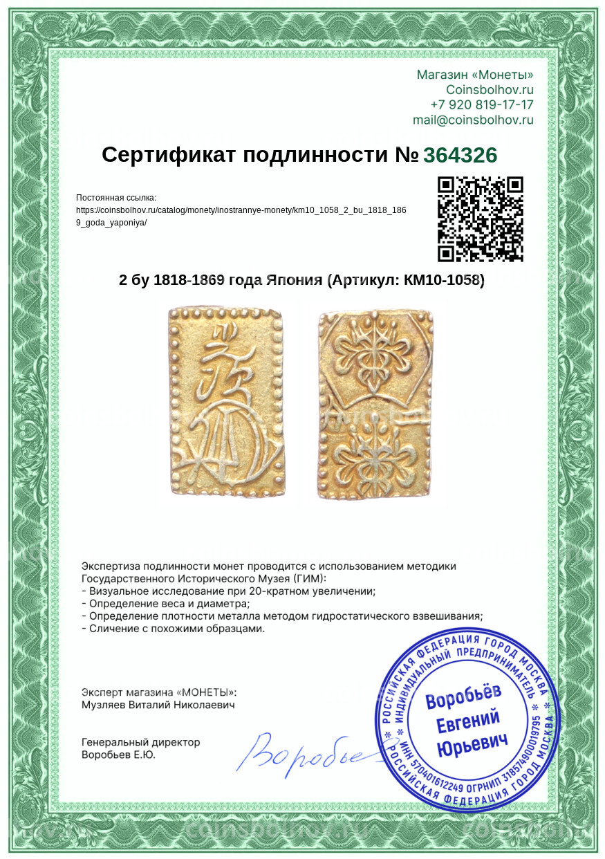 Монета 2 бу 1818-1869 года Япония