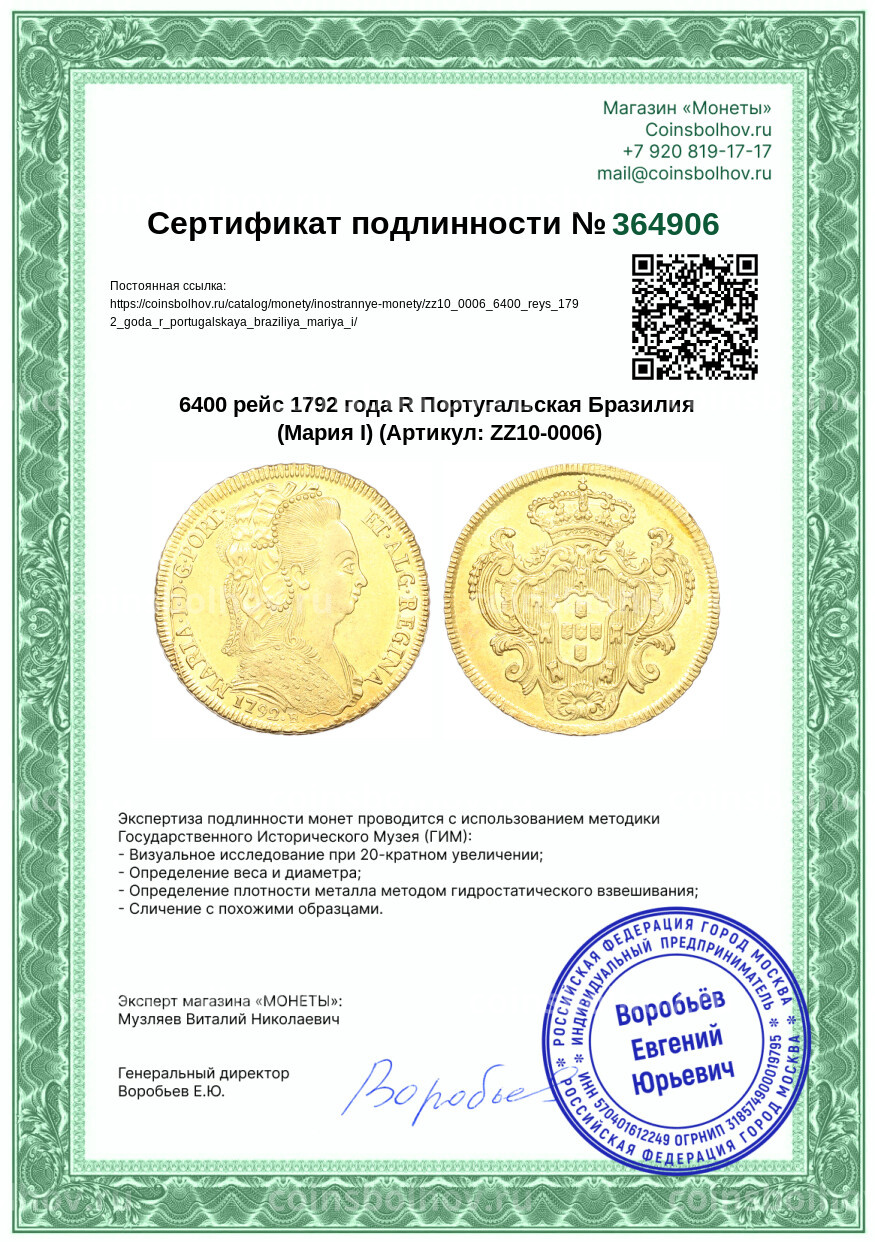 Монета 6400 рейс 1792 года R Португальская Бразилия (Мария I)