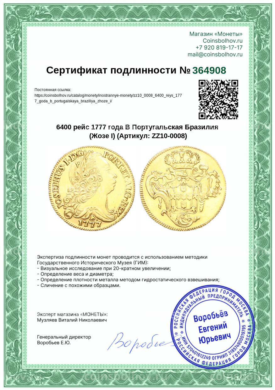 Монета 6400 рейс 1777 года B Португальская Бразилия (Жозе I)