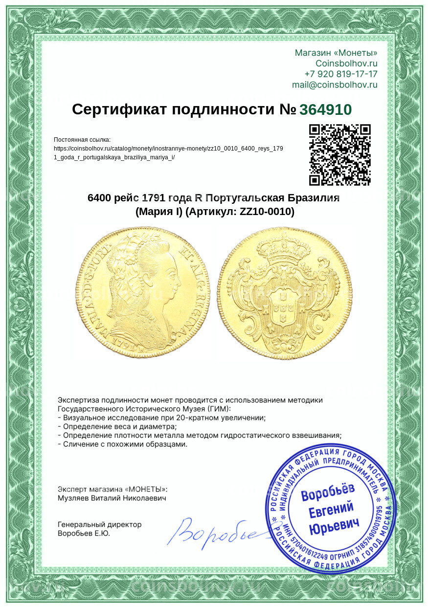 Монета 6400 рейс 1791 года R Португальская Бразилия (Мария I)