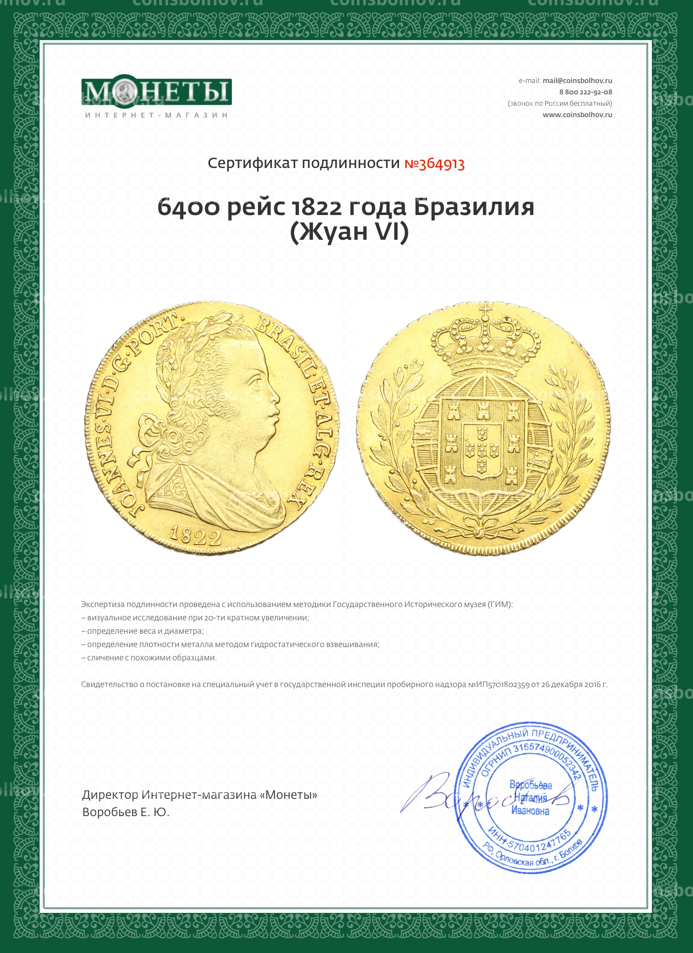 Монета 6400 рейс 1822 года Бразилия (Жуан VI)