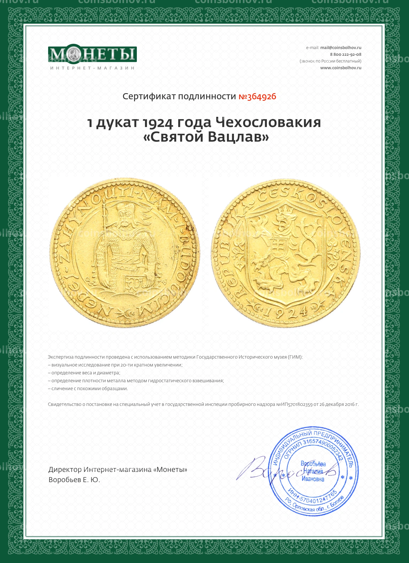 Монета 1 дукат 1924 года Чехословакия «Святой Вацлав»
