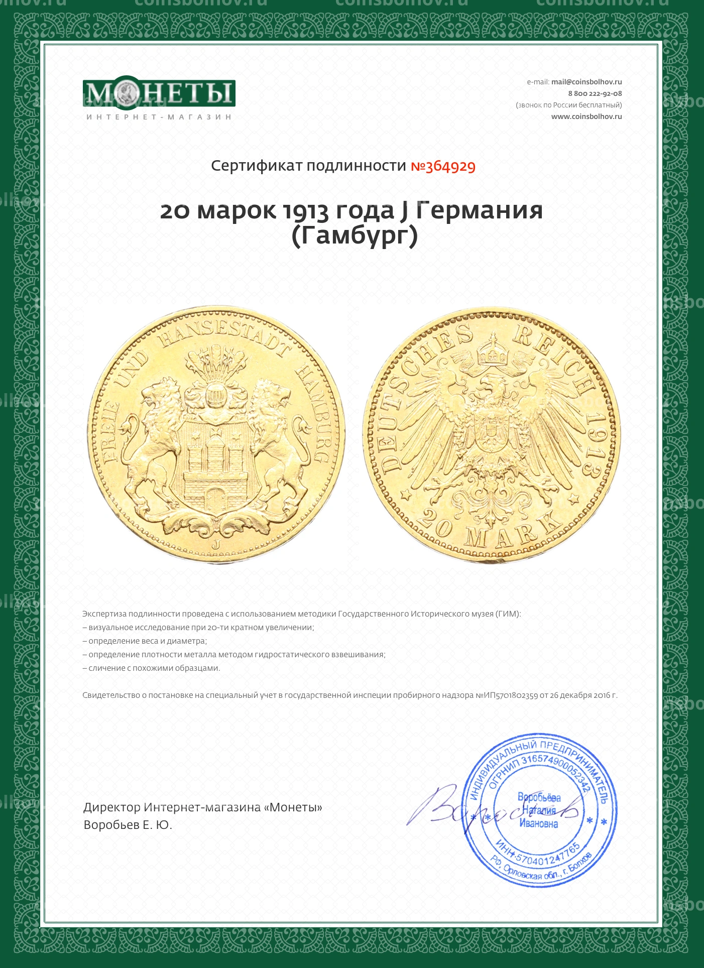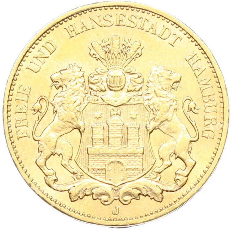 Монета 20 марок 1913 года J Германия (Гамбург)
