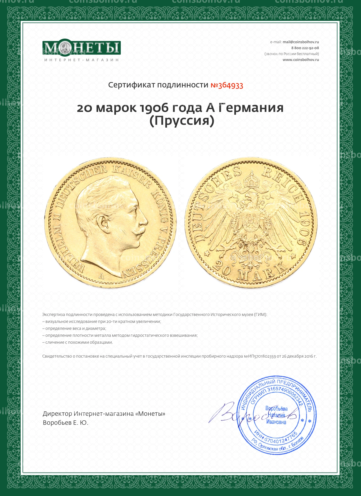 Монета 20 марок 1906 года A Германия (Пруссия)