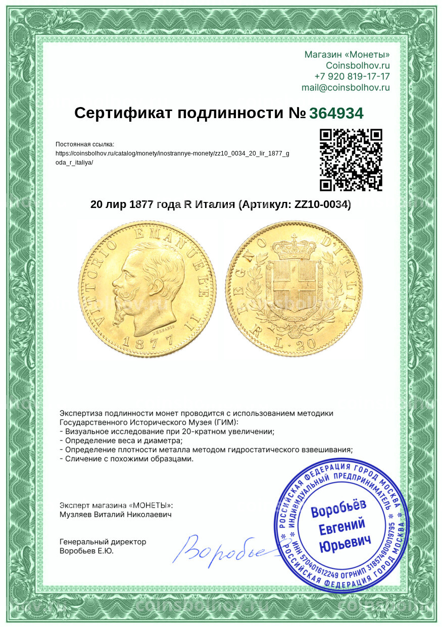 Монета 20 лир 1877 года R Италия