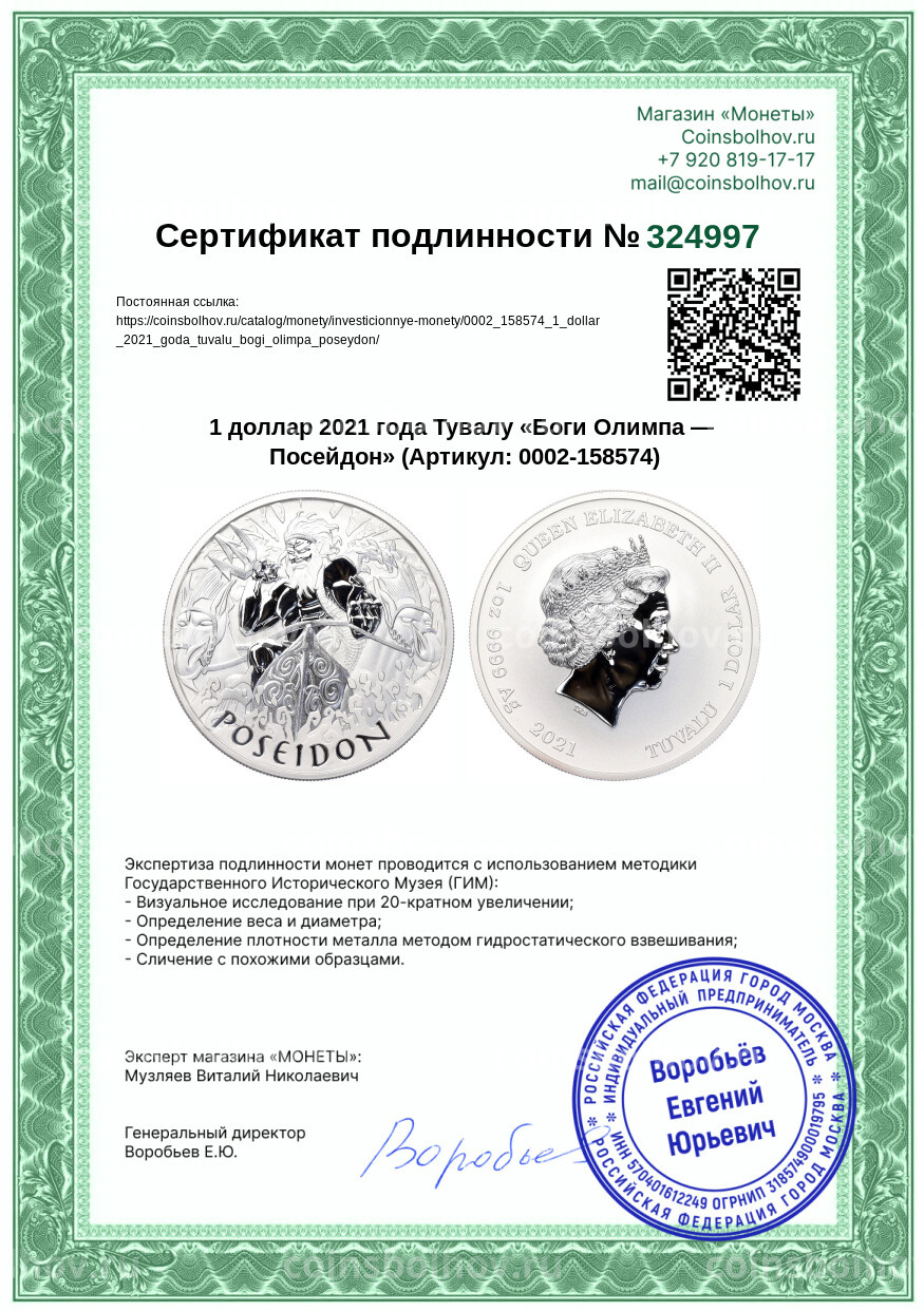 Монета 1 доллар 2021 года Тувалу «Боги Олимпа — Посейдон»