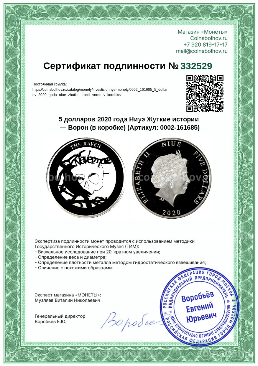 Монета 5 долларов 2020 года Ниуэ Жуткие истории — Ворон (в коробке)