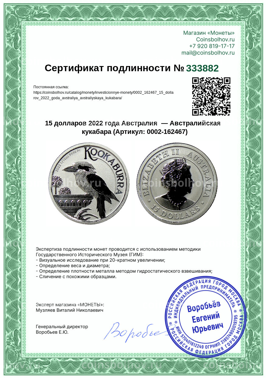 Монета 15 долларов 2022 года Австралия — Австралийская кукабара