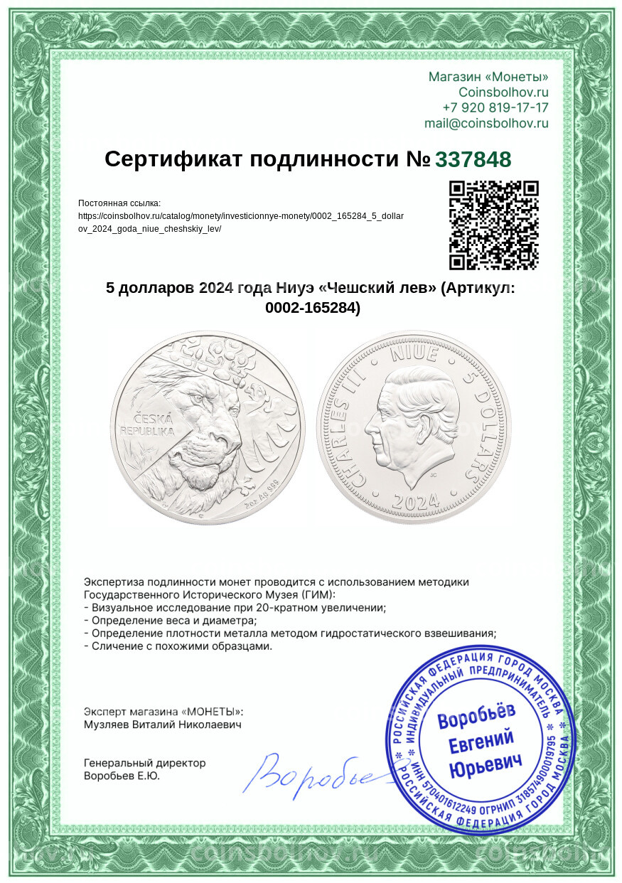 Монета 5 долларов 2024 года Ниуэ «Чешский лев»