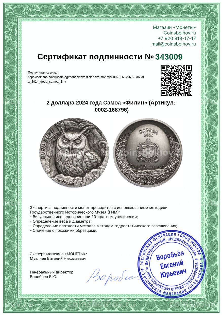 Монета 2 доллара 2024 года Самоа «Филин»