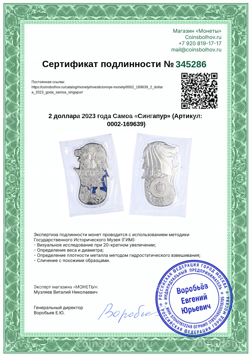 Монета 2 доллара 2023 года Самоа «Сингапур»