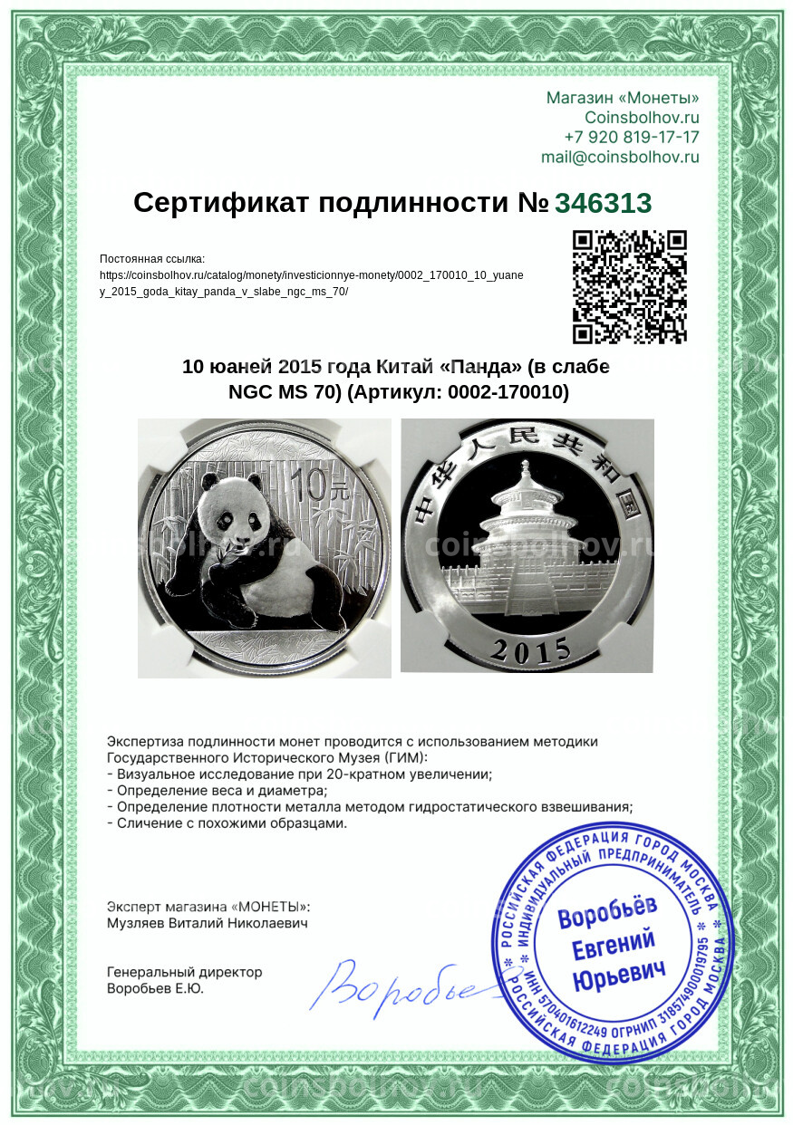 Монета 10 юаней 2015 года Китай «Панда» (в слабе NGC MS 70)