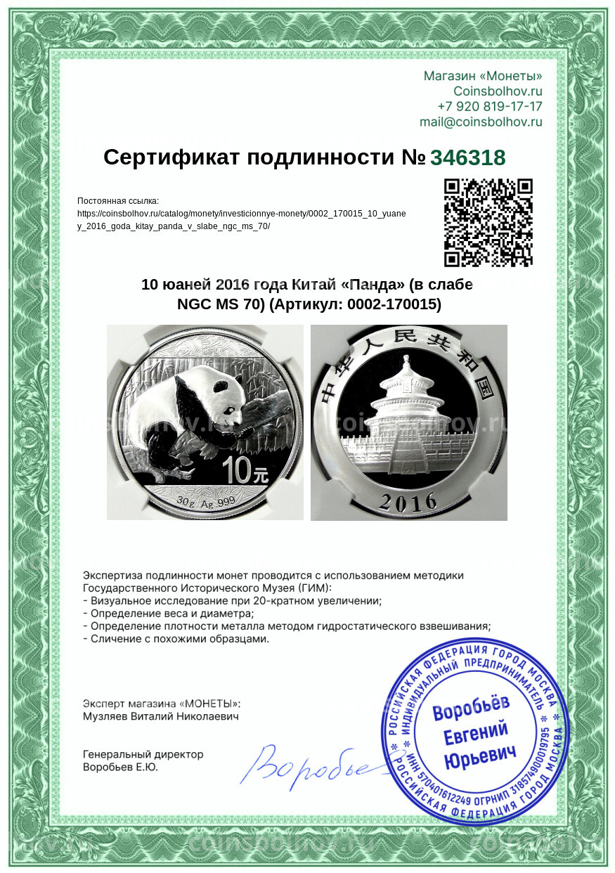 Монета 10 юаней 2016 года Китай «Панда» (в слабе NGC MS 70)
