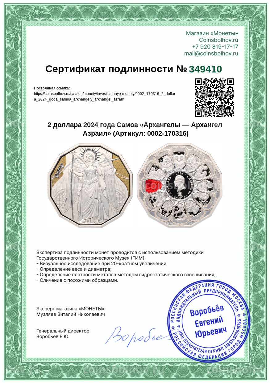 Монета 2 доллара 2024 года Самоа «Архангелы — Архангел Азраил»