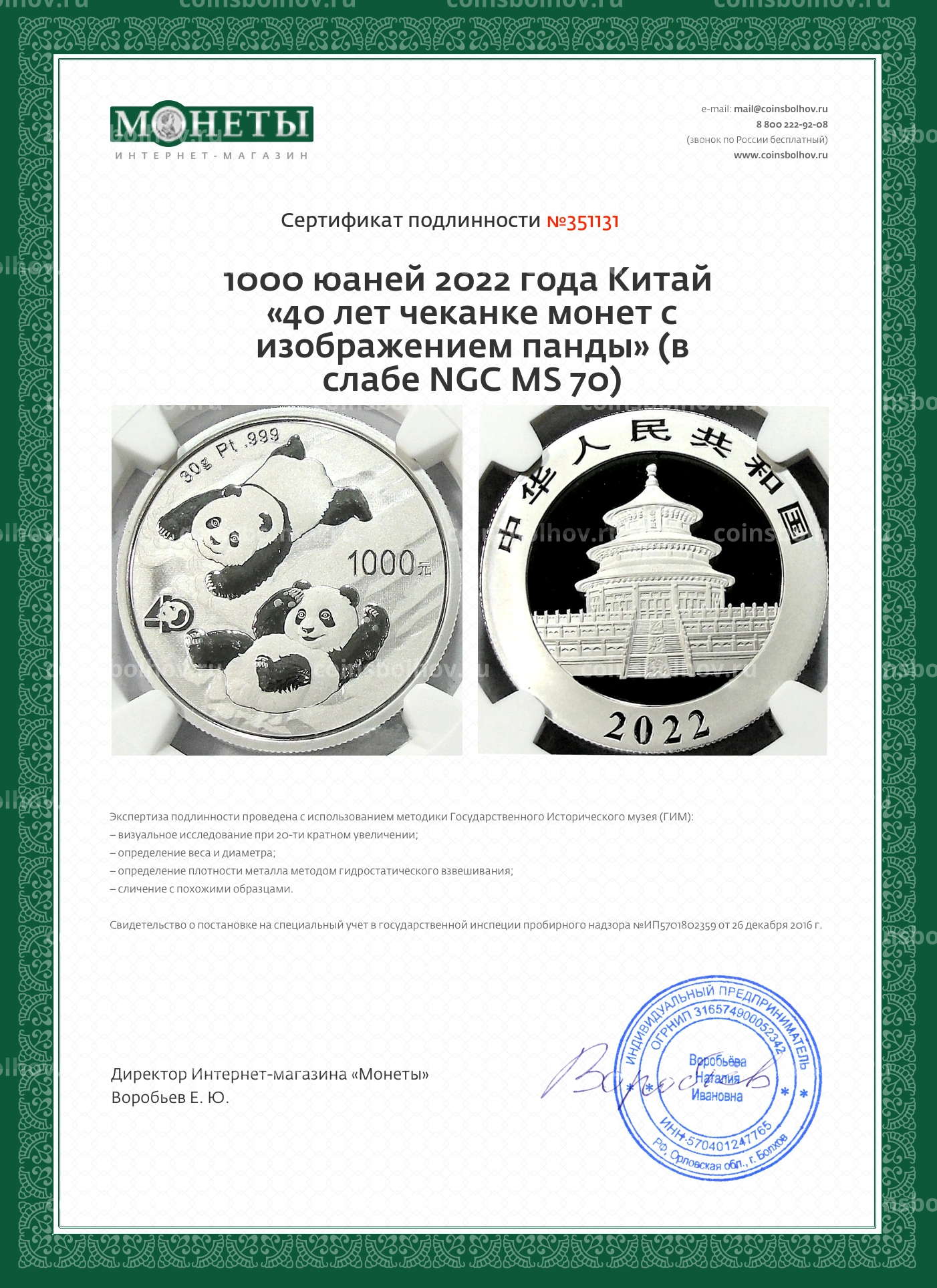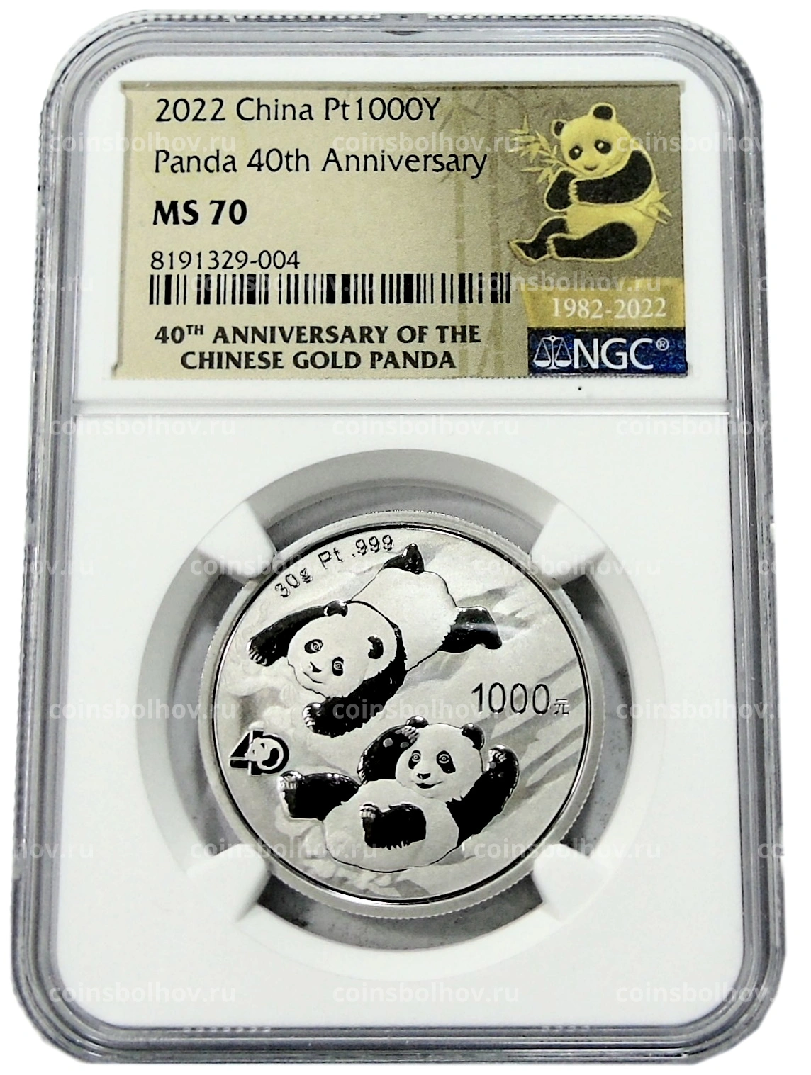 Монета 1000 юаней 2022 года Китай «40 лет чеканке монет с изображением панды» (в слабе NGC MS 70)