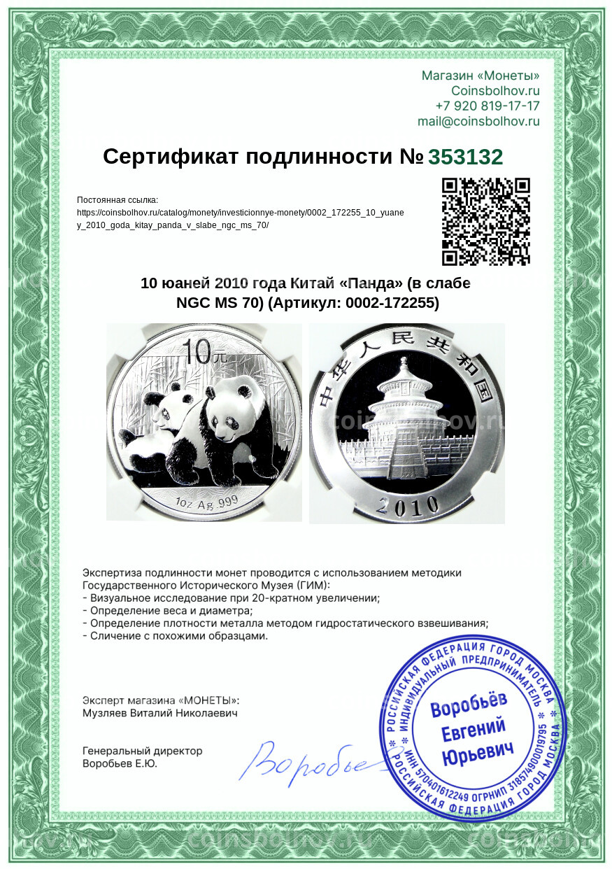 Монета 10 юаней 2010 года Китай «Панда» (в слабе NGC MS 70)