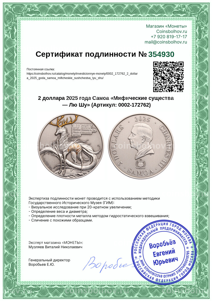 Монета 2 доллара 2025 года Самоа «Мифические существа — Лю Шу»