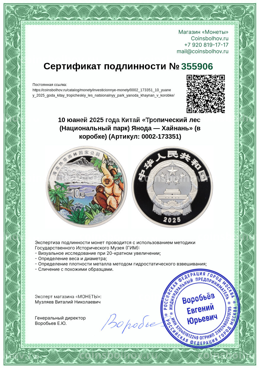 Монета 10 юаней 2025 года Китай «Тропический лес (Национальный парк) Янода — Хайнань» (в коробке)