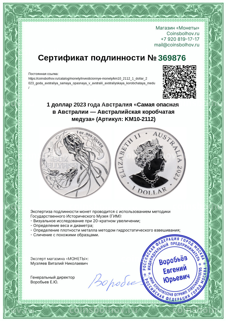 Монета 1 доллар 2023 года Австралия «Самая опасная в Австралии — Австралийская коробчатая медуза»