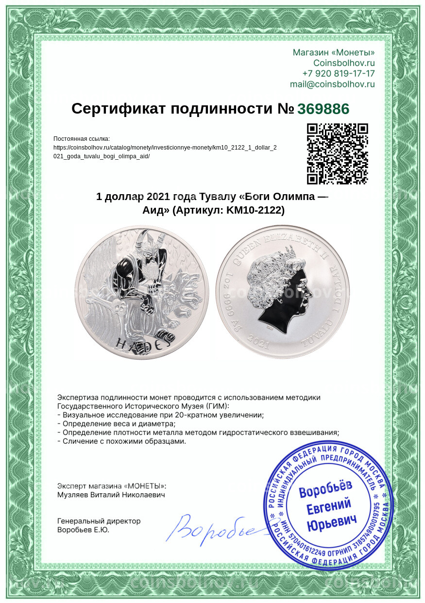 Монета 1 доллар 2021 года Тувалу «Боги Олимпа — Аид»