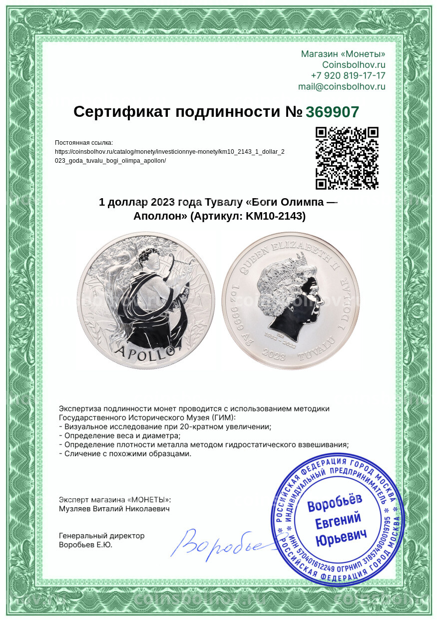 Монета 1 доллар 2023 года Тувалу «Боги Олимпа — Аполлон»