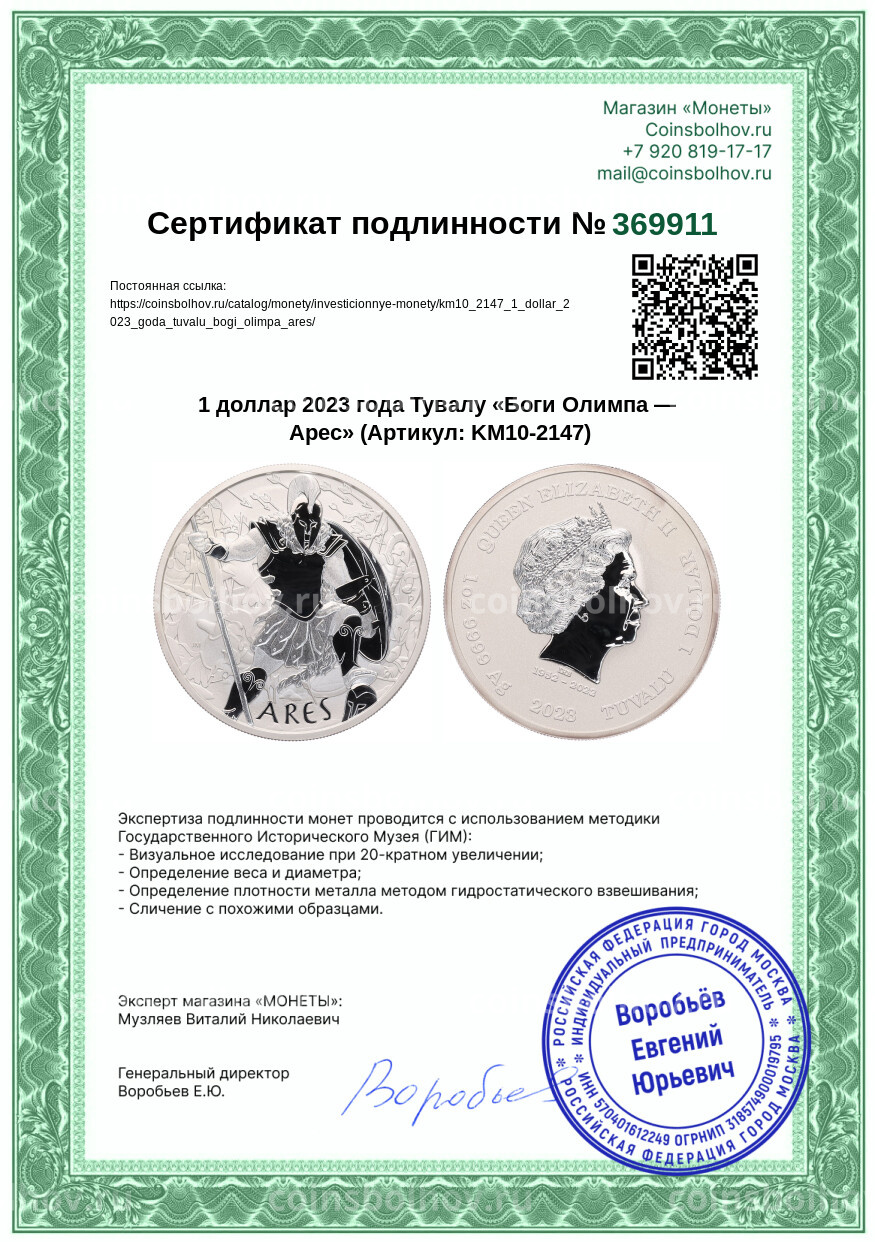 Монета 1 доллар 2023 года Тувалу «Боги Олимпа — Арес»