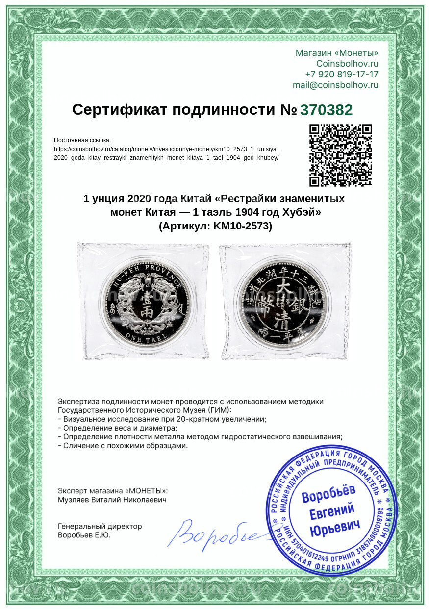 Монета 1 унция 2020 года Китай «Рестрайки знаменитых монет Китая — 1 таэль 1904 год Хубэй»