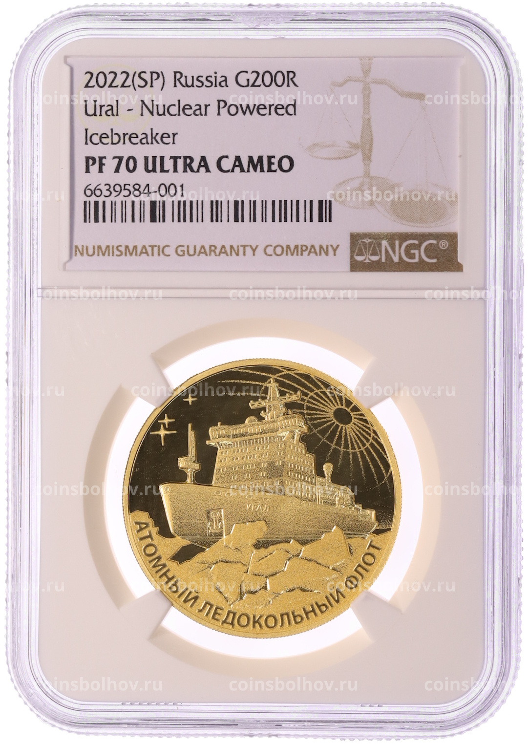 Монета 200 рублей 2022 года СПМД «Атомный ледокольный флот России — Атомный ледокол Урал» в слабе NGC (PF70 ULTRA CAMEO)